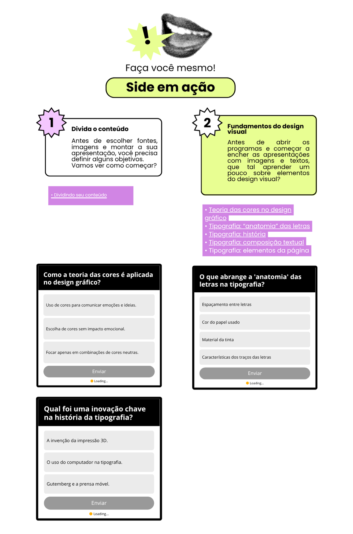 Side em ação1Divida o conteúdoAntes de escolher fontes, imagens e montar a sua apresentação, você precisa definir alguns objetivos. Vamos ver como começar?